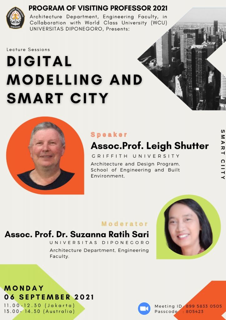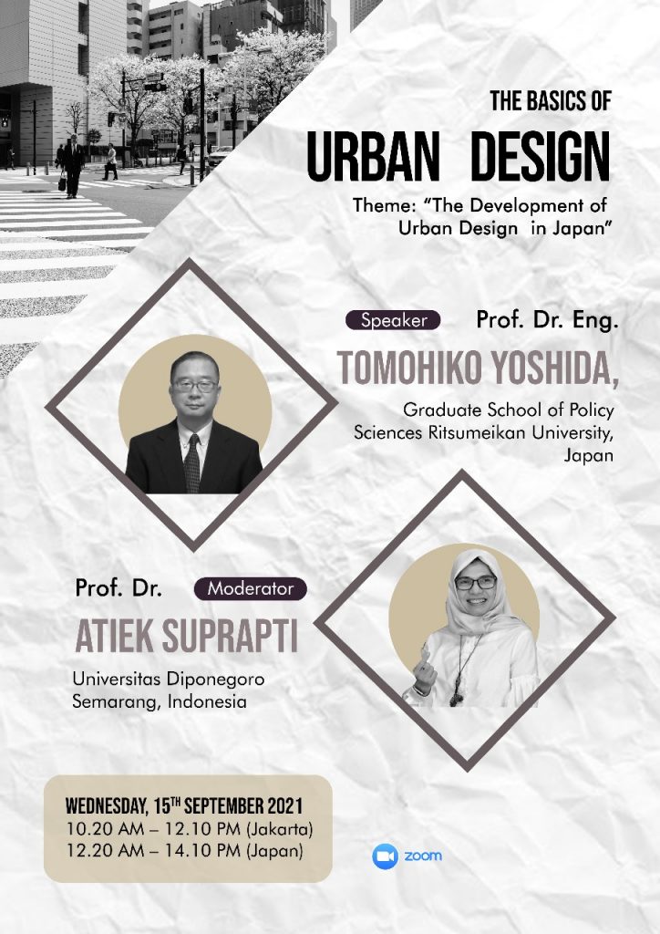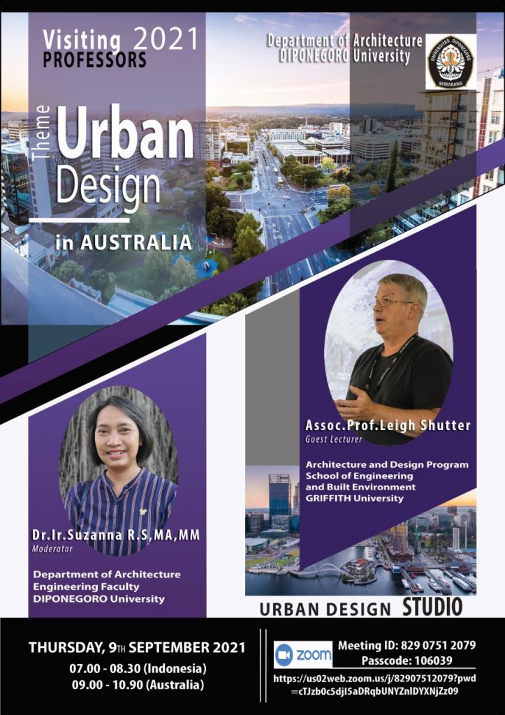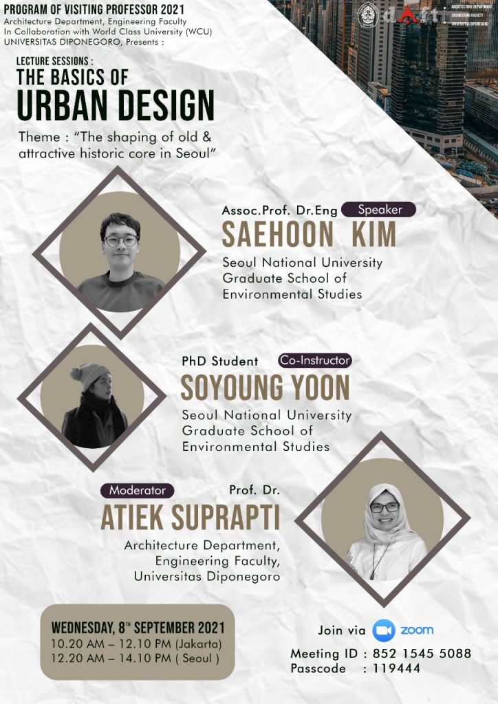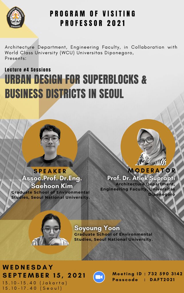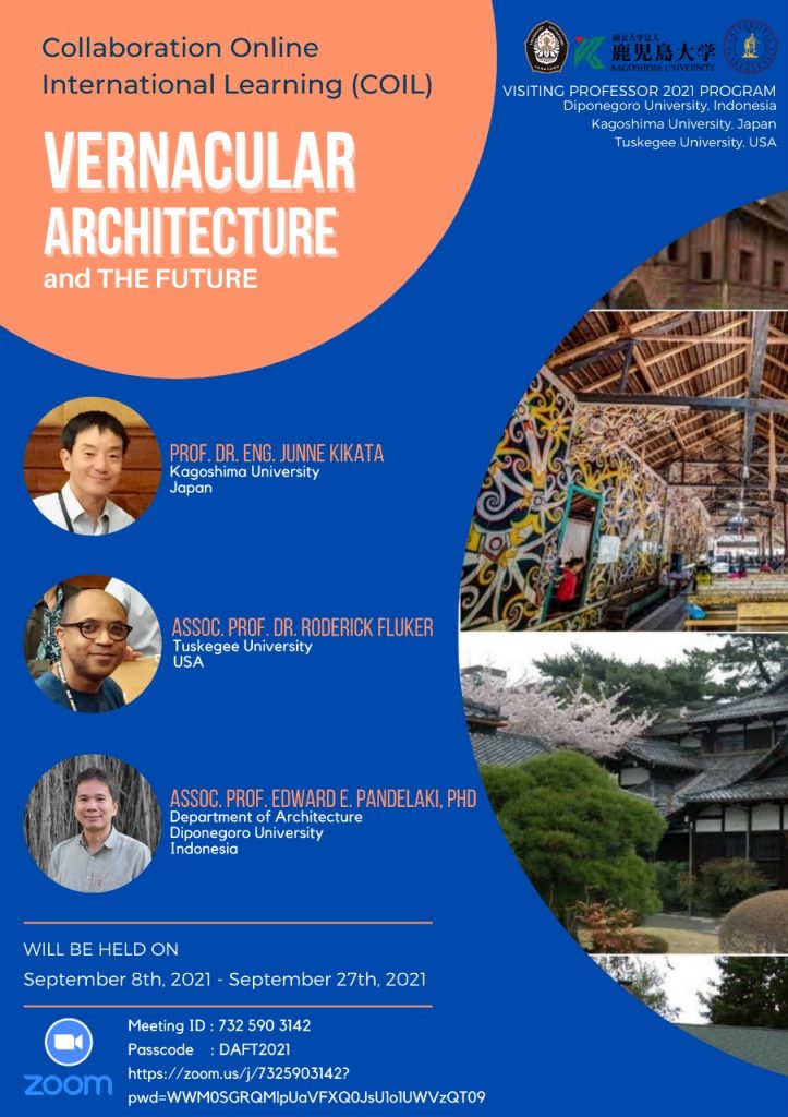Dalam rangka peningkatan academic reputation sebagai bagian dari program World Class University, Departemen Arsitektur Fakultas Teknik Universitas Diponegoro menyelenggarakan program virtual ‘Visiting Professor 2021’ yang mengangkat tema: International Academic Collaboration toward Sustainability in Architectural Design and Urbanism, through enhancing the ‘Wing+T’ (Local Wisdom, Inclusive Design, and Green Design, and Tourism). Kegiatan berlangsung antara September hingga Oktober 2021 yang dimulai dengan sesi Kick Off  pada hari Jumat, 27 Agustus 2021, jam 08.00 – 09.50 WIB  melalui streaming pada DAFT Undip official channel